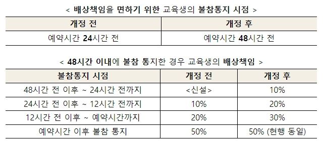 또한 종전 표준약관에 따를 때 교육생은 수업 예약시간 24시간 전에만 불참을 통지하면 면책됐으나, 학원 입장에서 24시간 이내에 노쇼로 발생한 예약 공백을 대체할 교육생을 구하기란 현실적으로 어렵고, 결국 그 시간 동안 학원과 강사는 일방적으로 손해를 감수해야 하는 불합리함이 있었다. 따라서 공정위는 이번 개정을 통하여 면책의 기준이 되는 불참통지 시기를 예약시간 48시간 전으로 늘리고, 아래와 같이 시간단계별로 배상책임을 차등화하여 소비자의 노쇼 방지를 유도하고자 했다.