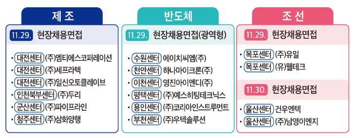 우선, 일자리 으뜸기업, 대량 구인이 예상되는 기업 등 지역 내 기업의 구인 수요를 사전에 파악하여 구직자와의 현장 채용면접을 운영한다. 11월 29일 「일자리 수요데이」에서는 제조업, 반도체업, 조선업 기업 등의 채용면접을 진행한다.