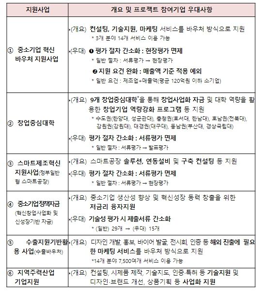 중소벤처기업부는 이에 대한 지원과 성과 달성을 위해 정책자금, 지능형(스마트)공장, 혁신이용권(바우처), 수출이용권(바우처) 등의 핵심 정책수단을 올해 2,790억원 규모로 사업(프로젝트) 참여기업에 우대 지원한다.