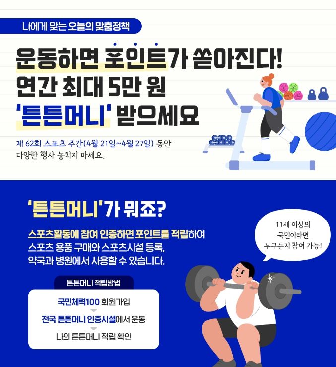 국민체력100 회원가입 → 전국 튼튼머니 인증시설에서 운동 → 나의 튼튼머니 적립 확인