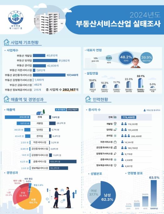 부동산서비스산업 실태조사 주요 결과는 2024년 전국 사업체는 약 28.2만 개로, 2023년(약 28.3만 개) 대비 약 0.2% 감소했다.