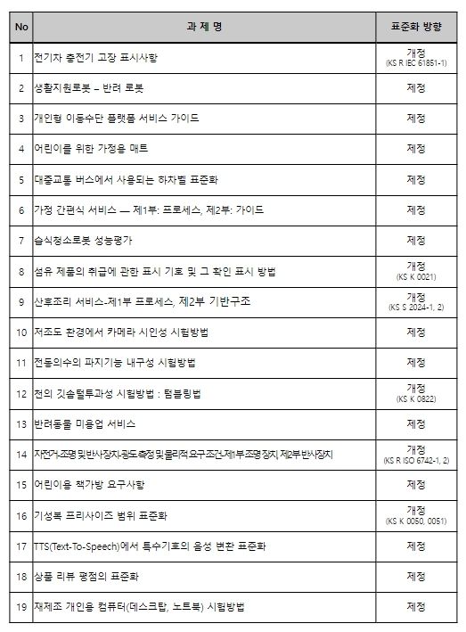 일상에서 사용하는 로봇, 전기차 충전기, 개인형 이동수단 플랫폼 등 제품과 서비스에 대한 품질 확보와 통일화를 통해 생활편의를 제고할 방침이다. ① 반려로봇의 성능기준과 평가방법 표준화를 통해 1인 가구, 노인가구 등의 생활 편의 향상을 추진한다. ②또한 전기차 충전 과정에서 발생 가능한 오류의 표시 내용을 통일화하여 전기차와 충전기의 고장 여부 확인이 어려웠던 불편을 해소할 예정이다. ③아울러 개인형 이동수단 플랫폼 서비스의 품질 제고를 위해 서비스 절차와 품질관리에 대한 표준화를 추진한다. 최종 선정된 표준화 과제에 대해서는 11월부터 이해관계자의 의견수렴을 거쳐 표준안 개발을 추진할 예정이다.