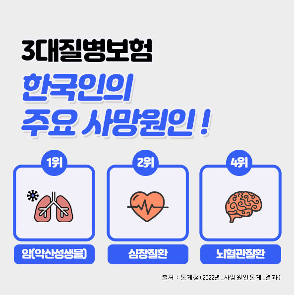 데일리굿타임 유종운 기자 | 흔히 3대질병이라 일컫는 암, 심혈관질환, 뇌혈관질환은 통계청 발표자료에 따르면 한국인의 주요 사망원인 중에서 3위 폐렴을 제외하고 1~4위를 차지하고 있으며, 이전부터 지금까지도 살면서 가장 먼저 대비해야 하는 치명적인 질병으로 강조되고 있다. 이러한 중대질병에 대비하기 위하여 상기 세가지 치명적인 질병을 집중보장하는 3대질병진단비보험을 많이 가입하고 있다. 3대진단비보험은 각각의 질병을 중점적으로 보장하면서도 가입자 특성에 맞는 특약을 추가함으로써 종합건강보험으로도 활용할 수가 있다.