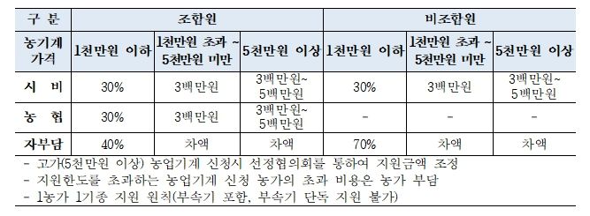 5,000만 원 미만 농업기계의 경우 구매비용의 60%(서울시 30%, 농협 30%) 최대 600만 원까지 지원하고 5,000만 원 이상 고가 기계는 최대 1,000만 원까지 지원한다. 지원 금액은 선정협의회에서 결정하며 지원금 외 차액은 신청 농가가 부담한다.