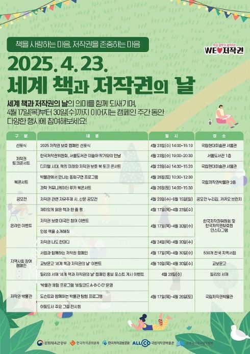 데일리굿타임 유다영 기자 | 문화체육관광부는 한국저작권위원회, 한국저작권보호원과 함께 ‘세계 책과 저작권의 날’을 맞이해 4월 17일부터 30일까지 ‘저작권 보호 캠페인’을 진행한다. 이를 통해 책과 저작권이 지닌 소중한 가치를 되새기고, 창작자의 권리를 존중하는 문화를 일상에 확산할 계획이다.