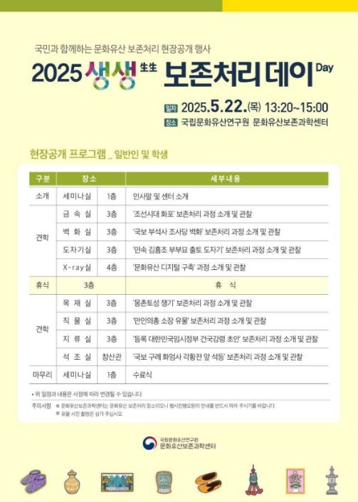 데일리굿타임 유다영 기자 | 국가유산청 국립문화유산연구원 문화유산보존과학센터는 오는 5월 21일과 22일 이틀간 문화유산보존과학센터(대전 유성구)에서 문화유산 보존처리 과정을 일반인과 청소년에게 공개하는 ‘생생生生보존처리 데이Day’를 운영한다.
