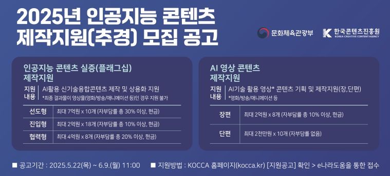 문체부와 콘진원은 인공지능 시대에서 케이-콘텐츠 산업의 세계 경쟁력을 확보하기 위해 2025년 3월부터 5월까지 본예산 80억 원으로 ‘인공지능 콘텐츠 제작 지원 사업’을 공모했으며, 그 결과 17개 과제를 선정하는 데 315개 과제가 지원하는 등 기업의 높은 관심을 확인할 수 있었다. 특히 인공지능 기술을 영상, 웹툰, 음악, 게임 등에 적용해 ▴제작비 절감을 통한 생산 혁신 및 창작 영역 확장, ▴디지털 인간(휴먼) 기술을 활용한 가상(버추얼) 아이돌 제작, 젊어 보이게 하는 ‘디에이징’ 등 새로운 콘텐츠 영역 확장, ▴인공지능 기술만으로 제작한 영화의 유통·배급 등을 통한 새로운 영화 시장 개척 등 인공지능 기술로 케이-콘텐츠 산업의 새로운 가능성을 열어 주는 과제들이 다양하게 선정됐다.