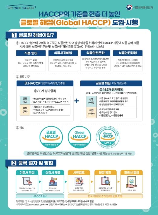 데일리굿타임 유주영 기자 | 식품의약품안전처는 글로벌 해썹(Global HACCP) 제도 시행에 따라 식품 및 축산물 해썹 인증업체를 대상으로 8월 13일 한국식품안전관리인증원(충북 오송 소재)에서 ‘글로벌 해썹 정책 설명회’를 개최한다고 밝혔다.