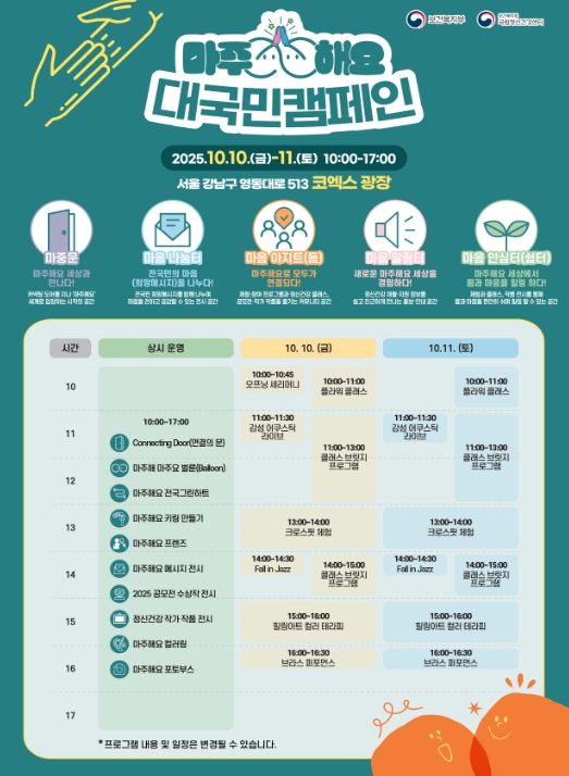 이번 캠페인은 ‘서로의 정신건강을 함께 마주한다’는 의미를 담은 정신건강 캠페인 브랜드 '마주해요'의 일환으로, 국민이 직접 참여하는 다양한 전시·체험·공연을 통해 정신건강의 중요성을 알리고, 정신건강에 대한 긍정적 공감대 확산을 목표로 한다.