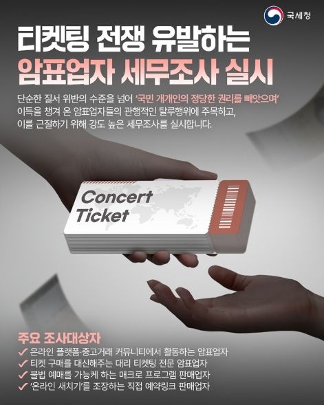 데일리굿타임 유주영 기자 | 단순한 질서 위반의 수준을 넘어 '국민 개개인의 정당한 권리를 빼앗으며' 이득을 챙겨 온 암표업자들의 관행적인 탈루행위에 주목하고, 이를 근절하기 위해 강도 높은 세무조사를 실시합니다.