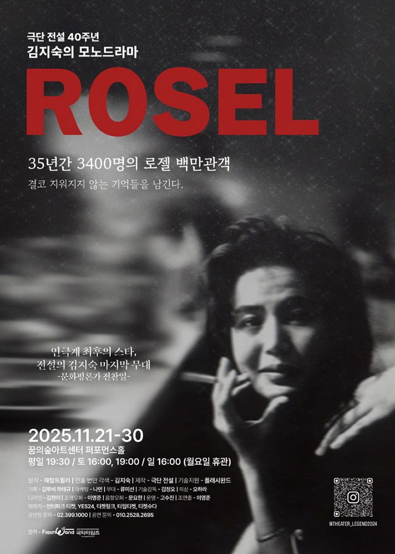 데일리굿타임 유종운 기자 | 극단 전설 40주년 기념작이자 배우 김지숙의 마지막 공연인 모노드라마 〈로젤〉이 오는 11월 21일부터 30일까지 꿈의숲아트센터 퍼포먼스홀에서 막을 올린다. 35년간 3,400회 이상 공연되며 백만 명이 넘는 관객을 울린 이 작품은 여성의 주체성과 인간성의 회복을 그린 한국 연극사의 대표작으로 꼽힌다.
