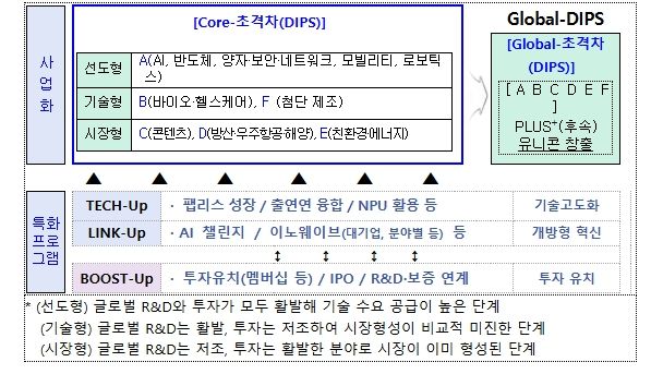 「초격차 프로젝트」는 기본지원(Core-DIPS)과 후속지원(Global DIPS) 등 2단계로 나누어 지원하며, 기술고도화(Tech Up), 개방형 혁신(Link Up),