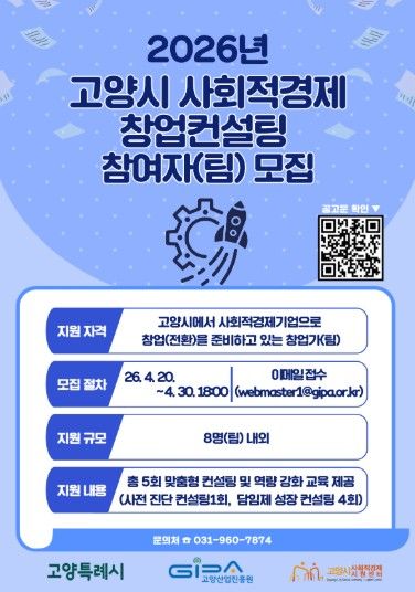 데일리굿타임 유종운 기자 | 고양산업진흥원이 운영하는 고양시사회적경제지원센터가‘2026년 고양시 사회적경제 창업컨설팅 사업’에 참여할 예비 창업자(팀)을 오는 30일까지 모집한다.