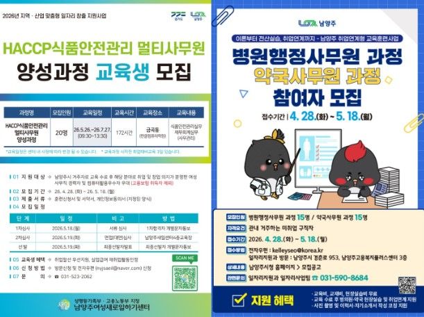 ‘HACCP 식품안전관리 멀티사무원 양성 과정’은 5월 26일부터 7월 27일까지 총 172시간 운영되며, 5월 18일까지 남양주여성새로일하기센터에 방문하거나 전자우편으로 신청하면 된다.