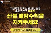 데일리굿타임 유주영 기자 | 지난 주말 전국 산불 22건 발생 주요 원인은 '부주의' 산불 예방수칙을 지켜주세요 · 산에서 취사, 흡연 등 금지 · 산 근처에서 쓰레기 소각 금지 · 연기, 불씨 보면 119 신고 "불법소각, 꽁초 투기 등 위반 행위 엄정 대응"