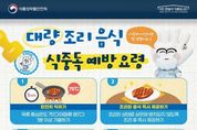 데일리굿타임 유주영 기자 | ■ 대량 조리 음식 식중독 예방요령 ① 완전히 익히기 육류 중심온도 75°C(어패류 85°C) 1분 이상 가열하기 ② 조리된 음식 즉시 제공하기 조리된 상태로 상온에 방치되지 않도록 조리 후 즉시 제공하기 ③ 가열 조리 후 신속히 냉각하기 가열 조리 후 즉시 섭취하지 않을 시, 여러 용기로 나누어 담거나 신속히 냉각하기 ④ 보관온도 유지하기 따뜻한 음식은 60°C 이상, 차가운 음식은 5°C 이하로 보관하기 ⑤ 재가열하여 섭취하기 보관된 음식 섭취 시, 충분히 가열 후 섭취하기 ■ 운반 시 식중독 예방 요령 · 차량·운반기구 청결히 관리하기 - 오염되기 쉬운 곳 세척·소독하고 청결 상태 수시로 확인하기 · 운반 시 음식 온도 관리 주의 - 따뜻한 음식과 차가운 음식이 서로 닿지 않게 구분하기 · 안전하게 포장하기 - 음식이 새거나 오염되지 않도록 완전히 밀폐되게 포장하기 · 운반 후 즉시 제공하기 - 음식 운반이 완료되면 즉시 제공하기