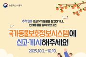 데일리굿타임 유주영 기자 | 추석 연휴 유실·유기동물을 발견하거나, 반려동물을 잃어버렸다면 국가동물보호정보시스템에 신고·게시해주세요! ■ 추석 연휴 유실·유기동물 구조 통합 신고시스템 운영으로 신속한 온라인 신고·접수 가능 · 기간: 2025.10.2.(목)~10.10.(금) · 신고 게시: 국가동물보호정보시스템 누리집 팝업창 ■ 유실·유기동물 온라인 신고·접수 방법 ① 유실·유기동물을 발견한 경우 국가동물보호 정보시스템 '동물발견' 배너 클릭 → 발견장소, 사진, 개체 특징 등 제보 등록 → 해당 지자체 보호센터 정보제공 → 지자체 동물보호센터 신속 대응 ② 반려동물을 분실한 경우 국가동물보호 정보시스템 '동물분실' 배너 클릭 → 반려동물 분실장소, 일시, 사진 등 정보 등록 → 시민 간 발견 정보 공유(댓글 창 활성화) → 필요시 분실신고 병행(등록동물 정보 변경) 유실·유기동물 구조 통합신고로 보호자를 빠르게 찾아드리겠습니다