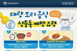 2025-09-26 유주영 기자데일리굿타임 유주영 기자 | ■ 대량 조리 음식 식중독 예방요령 ① 완전히 익히기 육류 중심온도 75°C(어패류 85°C) 1분 이상 가열하기 ② 조리된 음식 즉시 제공하기 조리된 상태로 상온에 방치되지 않도록 조리 후 즉시 제공하기 ③ 가열 조리 후 신속히 냉각하기 가열 조리 후 즉시 섭취하지 않을 시, 여러 용기로 나누어 담거나 신속히 냉각하기 ④ 보관온도 유지하기 따뜻한 음식은 60°C 이상, 차가운 음식은 5°C 이하로 보관하기 ⑤ 재가열하여 섭취하기 보관된 음식 섭취 시, 충분히 가열 후 섭취하기 ■ 운반 시 식중독 예방 요령 · 차량·운반기구 청결히 관리하기 - 오염되기 쉬운 곳 세척·소독하고 청결 상태 수시로 확인하기 · 운반 시 음식 온도 관리 주의 - 따뜻한 음식과 차가운 음식이 서로 닿지 않게 구분하기 · 안전하게 포장하기 - 음식이 새거나 오염되지 않도록 완전히 밀폐되게 포장하기 · 운반 후 즉시 제공하기 - 음식 운반이 완료되면 즉시 제공하기