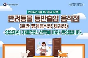 데일리굿타임 유주영 기자 | [영업자용] 2026년 3월 1일 본격 시행! 반려동물 동반출입 음식점(일반·휴게음식점·제과점) ■ 영업자의 자율적인 선택에 따라 운영됩니다. (방문 전) · 출입구 '반려동물 동반 가능' 안내문을 확인해 주세요. · 예방접종 완료 반려동물(개, 고양이 한정)만 동반 가능해요. (식사 때) · 매장 안에서 전용의자·케이지·목줄을 사용해주세요. · 조리 공간은 출입이 제한돼요. · 다른 손님을 배려해 충분한 거리를 유지해 주세요. (위생은 기본 매너) · 반려동물 식기구분, 음식은 덮개 사용을 꼭 해주세요. · 배변물은 전용 용기에 처리해 주세요. [소비자용] 반려동물 동반출입 음식점 ■ 반려인도 준비사항이 있어요! ① 예방접종은 기본 반려동물 동반출입 음식점 출입 시 예방접종 증명서 또는 사진 등 증빙자료를 보여주세요! ② '반려동물 동반출입 음식점' 안내문 확인 '반려동물 동반출입 음식점' 안내문을 확인 후 이용하세요! ③ 반려동물 동반출입 음식점에 있는 동안 반려동물은 이동하면 안돼요! 반려동물 간 또는