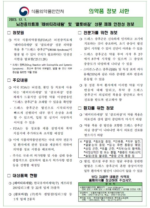 데일리굿타임 유주영 기자 | 식품의약품안전처는 뇌전증, 불안 등에 사용되는 ‘레비티라세탐’, ‘클로바잠’ 성분의 의약품을 복용할 경우에 드물지만 심각한 약물 반응인 ‘드레스 증후군(DRESS syndrome)’이 발생할 위험이 있다는 내용의 ‘의약품 정보 서한’을 배포했다.