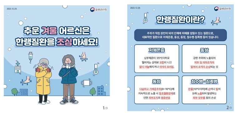 질병관리청 지영미 청장은 “한랭질환은 사전에 적절한 조치로 사고를 방지할 수 있으므로, 한파 대비 건강수칙을 준수해 줄 것”을 당부하며, 특히 “한파에 취약한 65세 이상 어르신과 노숙인, 독거노인 등 취약계층에 대해 각별한 관심이 필요”하다고 거듭 강조했다.