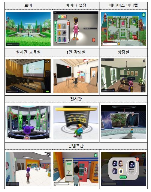 확장 가상 세계(메타버스)는 ▲비대면 실시간 교육을 위한 교육장 ▲개인 상담을 위한 사이버 공간의 상담실 ▲홍보영상 및 각종 마약류 폐해 정보 전시관 ▲폐해 체감을 위한 가상‧증강현실(AR·VR) 콘텐츠관 등으로 구성되어 있다.