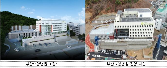 총사업비 452억 원이 투입된 부산요양병원은 지하 1층, 지상 5층 규모에 180병상(6인실)을 갖추고 있으며, 병상 사이 공간을 1.5미터 이상 확보하여 환자가 보다 쾌적한 환경에서 입원과 요양 치료를 받을 수 있다.