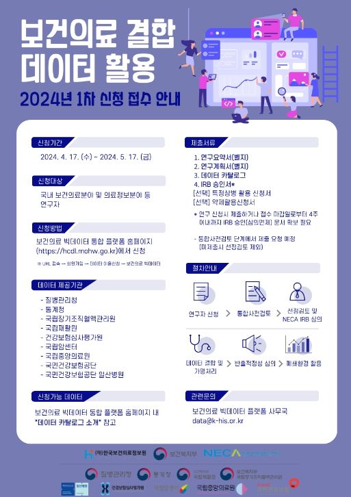 데일리굿타임 유주영 기자 | 보건복지부는 인공지능(AI) 신약 개발 등 디지털 헬스케어 연구 활성화를 위해 보건의료 빅데이터 플랫폼*을 통해 2024년 1차 보건의료 결합데이터 활용신청을 4월 17일부터 5월 17일까지 접수한다고 밝혔다.