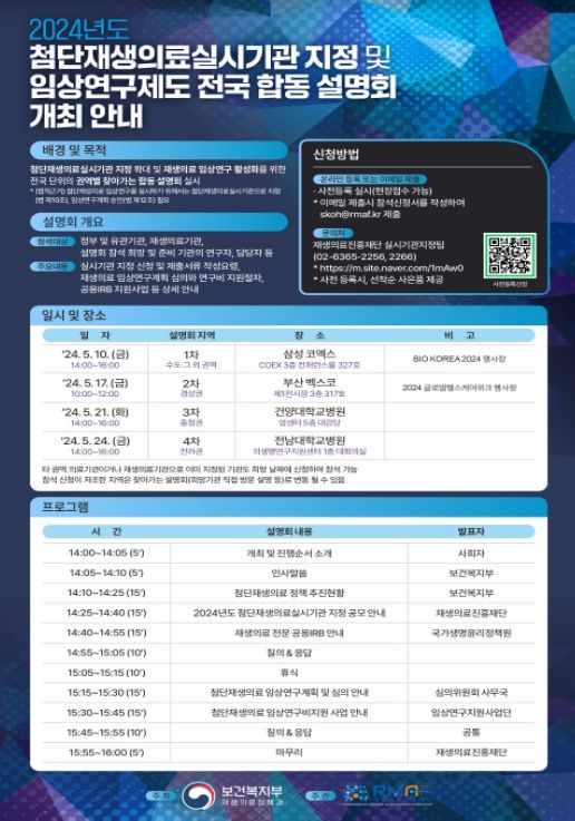 이번 설명회는 첨단재생의료실시기관 지정 공모, 임상연구 심의 및 연구비 지원, 공용기관생명윤리위원회(공용IRB) 지원사업 등을 상세히 안내하기 위한 것으로 5월 10일 서울을 시작으로 전국 4개 지역을 순회하며 실시할 예정이다.