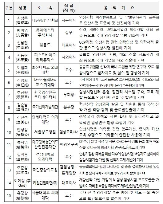 유공자 가운데 울산대학교 의과대학 이범희 교수는 연구자 주도 임상시험을 통해 수술이 불가능한 3세 이상 소아·청소년의 총상신경섬유종 치료제(성분명: 셀루메티닙황산염) 국내 도입에 이바지했고, 국립중앙의료원 조준성 감염병정보통계팀장은 취약계층 결핵환자들이 주로 이용하는 공공의료원과 함께 다제내성 및 중증 결핵환자 대상 임상시험을 실시하여 환자치료 및 임상시험 발전에 기여한 공로를 인정받았다.
