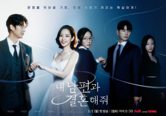 실타래처럼 얽힌 박민영, 나인우, 이이경, 송하윤의 복수와 사랑이 펼쳐질 tvN 새 월화드라마 ‘내 남편과 결혼해줘’는 2024년 1월 1일(월) 저녁 8시 50분에 첫 방송된다.