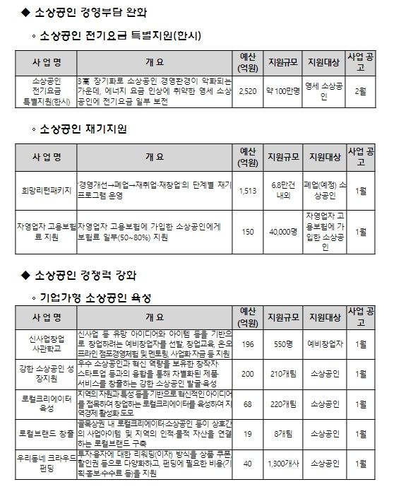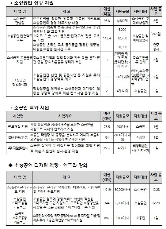 지원조건·내용 등 세부 사항이 담긴 사업별 공고는 1월 3일 수요일에 발표될 예정이며, 통합공고 및 세부사업 공고 등 내용은 중소벤처기업부 누리집, 소상공인시장진흥공단 누리집, 소상공인포털 등에서 확인할 수 있다.