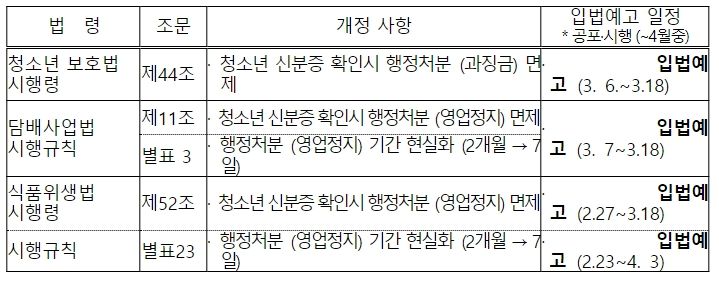 또한, 2월 15일에는 중소벤처기업부 주관 「제1차 선량한 소상공인 보호 관계기관 협의회」를 개최해, 지자체의 행정조사 과정에서 보안용감시카메라(CCTV) 또는 다수의 진술 등을 통해 영업자가 청소년의 신분증을 확인한 사실이 객관적으로 입증되는 경우, 수사‧사법 기관의 조사‧판단 이전에도 행정처분을 면제할 수 있도록 하는 제도개선 및 적극행정을 추진하기로 했다.