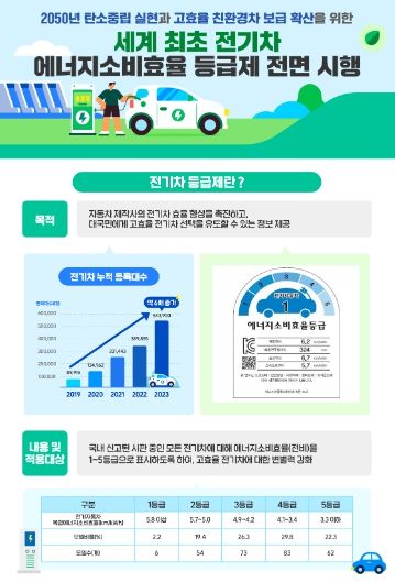 데일리굿타임 유종운 기자 | 2024년 4월 1일부터 전기차 에너지효율 등급제가 전면 시행됨에 따라 국내 신고된 시판 중인 모든 전기차(278개 모델)는 5단계 등급으로 구분된 전기차 등급 라벨을 부착하게 된다.