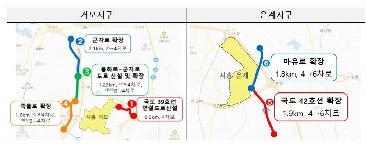 시흥지역 6개 집중투자사업(➊국도 39호선 연결도로 신설, ➋군자로 확장, ➌봉화로~군자로 신설 및 확장, ➍죽율로 확장, ➎국도 42호선 확장, ➏마유로 확장)에 대해 완공 시기를 최대 15개월 단축할 계획이다.
