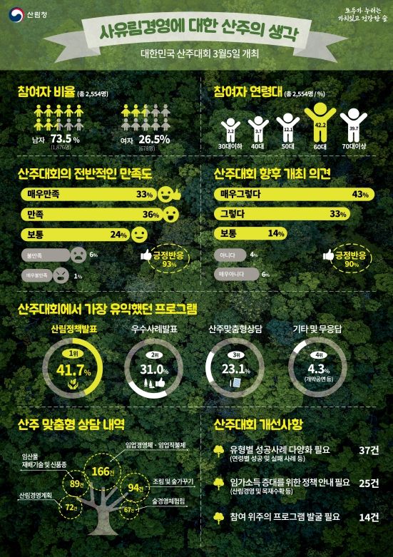 또한 ‘대한민국 산주대회’에 대해 2,554명이 참여한 만족도 조사 결과, 2,381명인 93%가 전반적인 만족도에서 긍정 반응이라고 응답했으며, 새로운 정책, 사유림 경영 우수사례, 산주 맞춤형 상담 등의 인기가 높은 것으로 나타났다.