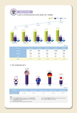 2024년 기준 전국 공공도서관 수는 1,296개관으로 전년(1,271개관) 대비 2.0% 증가했다. 이에 따라 공공도서관 1관당 봉사 대상 인구는 39,519명으로 줄어, 공공도서관의 양적 확충과 함께 국민의 도서관 접근성도 꾸준히 개선되고 있는 것으로 나타났다.