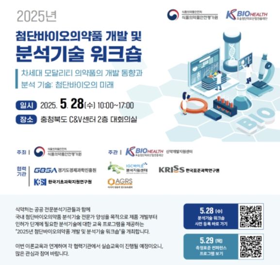 데일리굿타임 유주영 기자 | 식품의약품안전처 소속 식품의약품안전평가원은 첨단바이오 분야 분석기술 전문인력을 양성하기 위한 ‘제12회 첨단바이오의약품 개발 및 분석기술 워크숍’을 5월 28일 충청북도C&V센터에서 개최한다.
