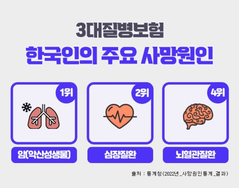 데일리굿타임 유종운 기자 | 흔히 3대질병이라 일컫는 암, 심혈관질환, 뇌혈관질환은 통계청 발표자료에 따르면 한국인의 주요 사망원인 중에서 3위 폐렴을 제외하고 1~4위를 차지하고 있으며, 이전부터 지금까지도 살면서 가장 먼저 대비해야 하는 치명적인 질병으로 강조되고 있다. 이러한 중대질병에 대비하기 위하여 상기 세가지 치명적인 질병을 집중보장하는 3대질병진단비보험을 많이 가입하고 있다. 3대진단비보험은 각각의 질병을 중점적으로 보장하면서도 가입자 특성에 맞는 특약을 추가함으로써 종합건강보험으로도 활용할 수가 있다.