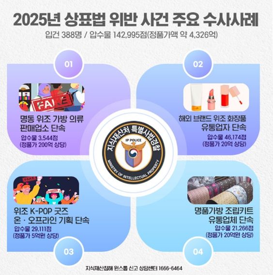 - 입건 388명 / 압수물 142,995점(정품가액 약 4,326억)