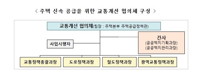 협의체는 주택공급추진본부 주택공급정책관을 팀장으로 교통정책총괄과장, 도로정책과장, 철도정책과장, 광역교통정책과장으로 구성되며, 주택공급 대상지와 관련하여 도로·철도·대중교통 등 교통 전반에 관련한 개선방안을 종합적으로 검토할 계획이다.
