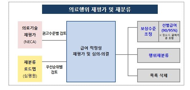 정부는 건강보험에 등재된 의료행위(기술)에 대한 재평가 및 재분류 체계를 정비하여 환자에게는 안전하고 유효한 의료기술을 제공하고 의료기관에는 적정 보상이 이루어질 수 있도록 사후관리체계를 마련한다.