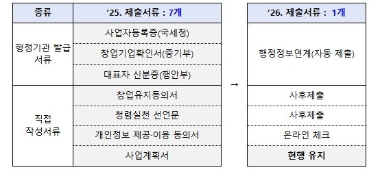 행정정보 연결로 사업자등록증, 재무제표 등 행정서류는 자동수집한다. 개인정보제공동의서 등은 온라인 체크로 대체한다. 또한, 기업 심사에 불필요한 서류는 폐지하거나 선정된 기업만 제출한다. 사업계획서 제한 분량도 평균 14장에서 9.4장까지 30% 이상 감축할 계획이다.