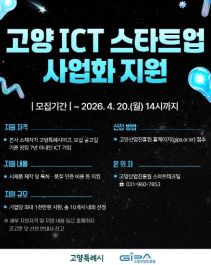 데일리굿타임 유종운 기자 | 고양산업진흥원이 ‘2026년 고양 ICT 스타트업 사업화 지원사업’ 참여 기업을 모집한다.