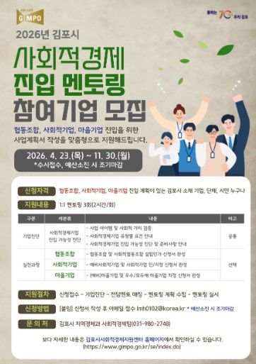 데일리굿타임 유종운 기자 | 김포시는 협동조합, 사회적기업, 마을기업 등 사회적경제기업 진입을 지원하기 위해 ‘2026년 김포시 사회적경제 진입 멘토링’ 참여기업을 오는 11월 30일까지 수시 모집한다.