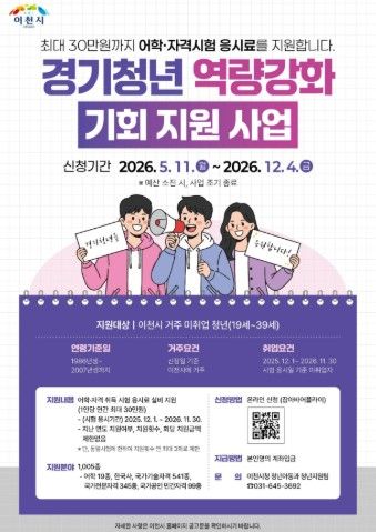 데일리굿타임 유종운 기자 | 이천시가 오는 5월 11일부터 미취업 청년의 어학·자격시험 응시료를 지원하는 ‘경기청년 역량강화 기회지원 사업’ 대상자 모집에 들어간다.