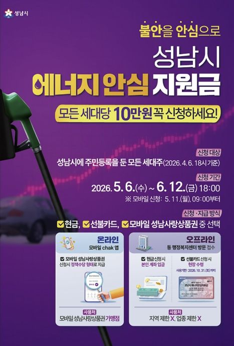 데일리굿타임 유종운 기자 | 성남시는 중동 사태에 따른 국가 자원안보 위기 경보 발령으로 경제적 부담이 커진 시민들을 지원하기 위해 전국 최초로 ‘성남시 에너지 안심지원금’을 오는 5월 6일부터 신청을 받는다고 밝혔다.