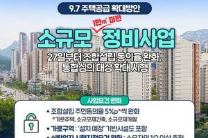데일리굿타임 유주영 기자 | ■ 소규모(1만㎡ 미만) 정비사업 - 27일부터 조합설립 동의율 완화, 통합심의 대상 확대 시행! ■ 사업요건 완화 · 조합설립 주민동의율 5%p*씩 완화 *가로주택, 소규모재건축, 소규모재개발 · 가로구역: '설치 예정' 기반시설도 포함 · 신탁업자 시행지정요건 완화: 소유자의 1/2 이상 추천 ■ 사업성 개선 · 임대주택 인수가격 상향: 기본형건축비의 80% 수준 · 법적상한용적률의 1.2배까지 건축 (사업구역 인근 토지를 기반 시설·공동 이용시설 부지로 제공 시) · 경사지 가로구역 건폐율 특례→사업전체구역으로 확대 ■ 통합 심의 대상 확대 · 경관심의, 교육환경평가 등 대상 확대, 사업 속도↑