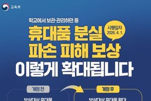 데일리굿타임 유주영 기자 | 학교에서 보관·관리하던 중 휴대품 분실·파손 피해 보상 이렇게 확대됩니다. (시행일자 2026.4.1.) ■ 개정 전 보상대상 휴대품: 3종 - 휴대폰, 태블릿PC, 노트북 - 보상한도 100만 원 ■ 개정 후 보상대상 휴대품 확대: 3종 → 5종 - 휴대폰, 태블릿PC, 노트북 (신규) 무선이어폰, 스마트워치 - 보상한도 확대 100만 원 → 200만 원