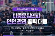 데일리굿타임 유주영 기자 | 방탄소년단(BTS) 컴백 행사 다중운집인파 안전 관리 총력 대응 - BTS 컴백 행사 인파 안전관리 관계기관 대책회의 '26.3.11.(수) 개최 ▲ 행정안전부 - 다중운집인파 재난 위기경보 '주의' 단계 발령 일시: 3.21.(토) 00:00~24:00 / 지역: 서울 종로구·중구 - '정부합동안전점검단' 구성, 안전관리 실태 사전 점검 ▲ 문화체육관광부 - 공연 안전을 위한 자문 및 무대시설·객석 점검 ▲ 보건복지부 응급 환자 발생 대비, 재난의료지원팀(DMAT) 및 보건소 신속대응반 출동체계 사전 구축 ▲ 경찰·소방 - 행사장 주변 질서 유지 및 치안 확보, 대테러 방지 활동 - 구조·구급요원·구급차 현장 배치 ▲ 서울시 - 시민안전대책본부 가동, 안전관리계획 이행 여부 확인 - 안전 안내 문자 발송 및 질서 있는 관람 유도